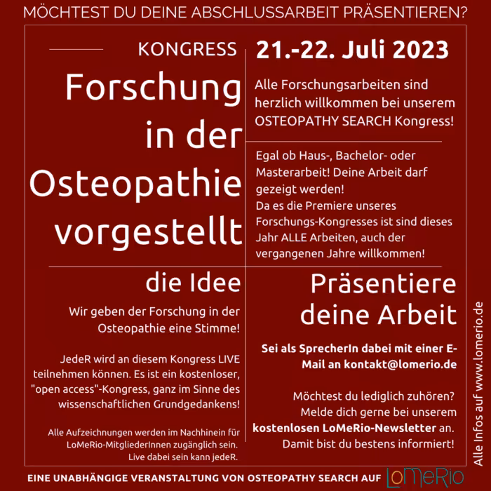 LoMeRio ist eine Online-Osteopathie-Gemeinschaft, wir freuen uns über euer Interesse und ‘Dabei Sein’. Ihr findet alle weiteren Informationen, sowie deinen Zugang auf der LoMeRio-Plattform.
